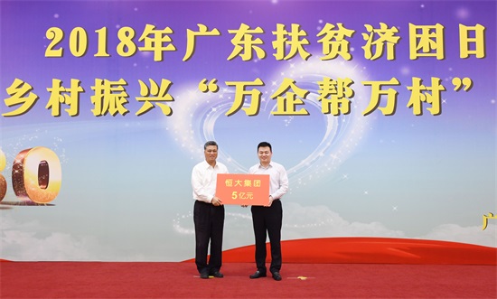 活动仪式上,恒大集团捐款5亿元,用于帮扶河源市连平县、和平县发展油茶、铁皮石斛、猕猴桃、花卉等特色产业,连片打造现代农业示范园;同时,在产业帮扶项目周边,整体规划、集中建设山美水美、有特色、有产业、能造血的美丽乡村示范村。截至目前,恒大已累计为广东扶贫济困日活动捐款超20亿元。