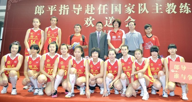 5月8日,郎平指导赴任国家队主教练欢送会在恒大御景半岛举行。广东省体育局副局长甘焯雄,恒大集团副总裁、广东恒大排球俱乐部董事长刘永灼,新任中国女排国家队主教练、广东恒大排球俱乐部主教练郎平指导,广东恒大排球俱乐部教练组及球员,以及来自全国数十家媒体的记者和数百位球迷参加了欢送会。
